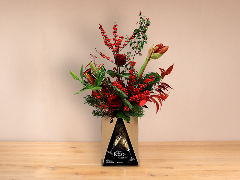 Feestelijk boeket in warm rood met bloemen uit het seizoen en weelderig dennengroen. BloemenboxX geleverd met themakaart "Fijne feestdagen".